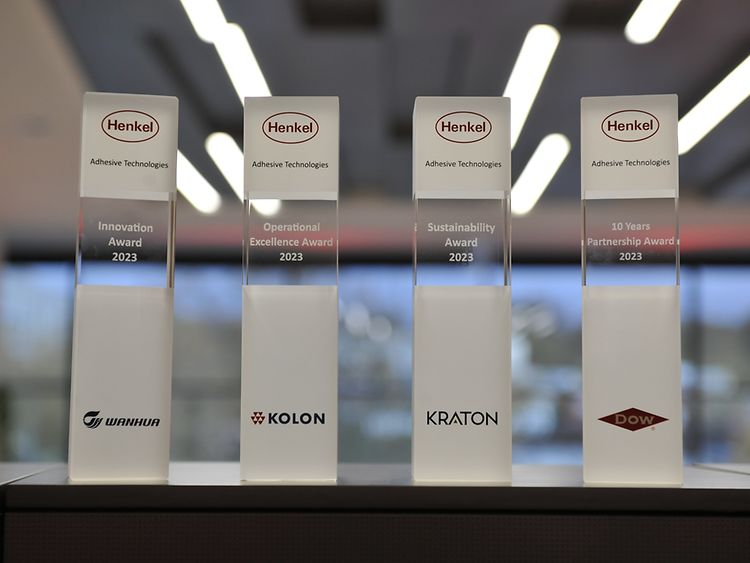 Henkel Adhesive Technologies has awarded the performance of its strategic partners with its annual Supplier Awards. With these recognitions the business unit honors the close and successful collaboration across its value chains for the 10th consecutive year. In 2023 Adhesive Technologies has awarded the companies Kraton, Wanhua and Kolon in the three standard categories of Sustainability, Innovation and Operational Excellence, and, in addition, presented a special 10-Years partnership award to Dow.