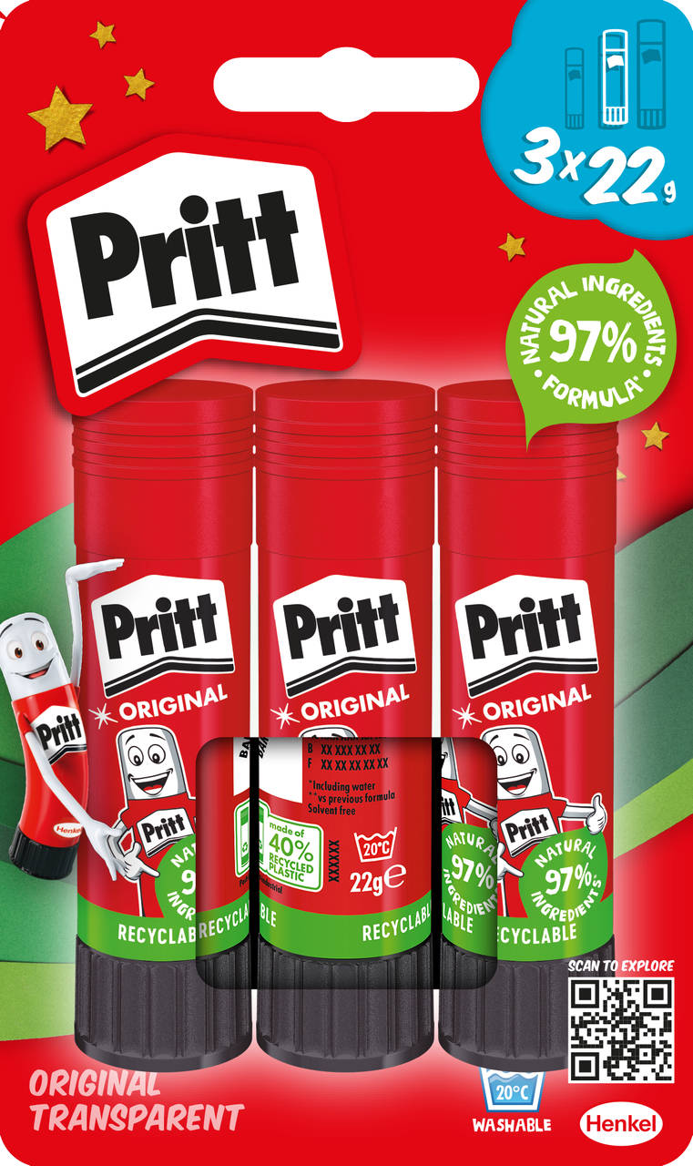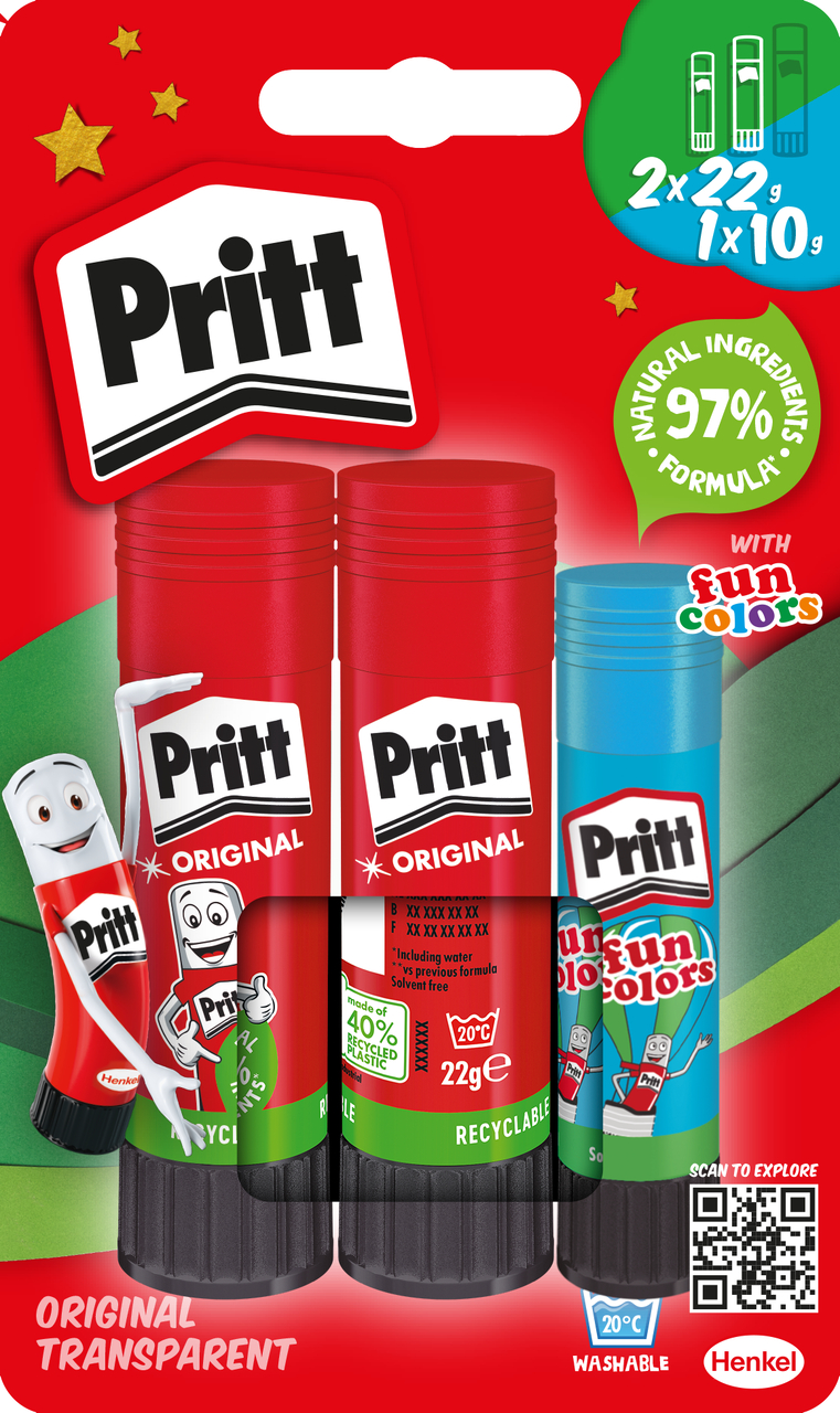 Since their invention in 1969, Pritt glue sticks have enabled countless children around the world to express their creativity and improve their motoric skills by crafting. Today’s generation of Pritt sticks feature 97 percent natural ingredients (including water) and up to 65 percent recycled plastic in the stick, without any restrictions in performance. It offers a strong initial tack, easy repositioning, and the best crafting results across the category.